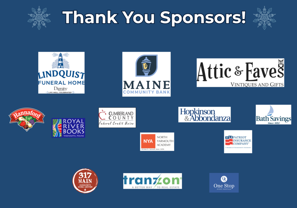 A huge thank you to our sponsors whose generosity made the evening possible: Lindquist Funeral Home, Maine Community Bank, Attic and Eaves, Cumberland County Federal Credit Union, North Yarmouth Academy, Hopkinson and Abbondanza, Hannaford, Patriot Insurance, Royal River Books and Bath Savings. We would also like to thank our supporters: 317 Main Community Music Center, Black Tie Catering and Events, One Stop, and Mike Carey from Tranzon Auction Properties who ran a fantastic live auction!