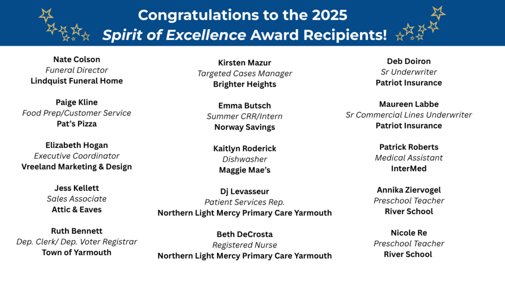 If you see any of these smiling faces around town be sure to congratulate them on receiving a 2025 Spirit of Excellence Award! These employees were nominated by their supervisors for showing pride in their work, consistently going above and beyond, and inspiring and serving as role models to others in the workplace. The Spirit of Excellence Awards are a joint initiative by the Rotary Club of Yarmouth and The Yarmouth Chamber of Commerce.